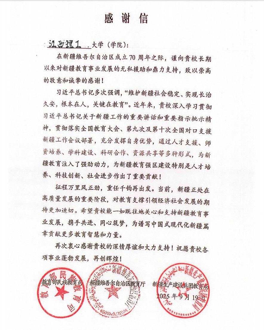 本网讯 在新疆维吾尔自治区成立70周年之际,教育部民族教育司、新疆维吾尔自治区教育厅、新疆生产建设兵团教育局三家单位联合向学校发来感谢信,感谢体育博彩