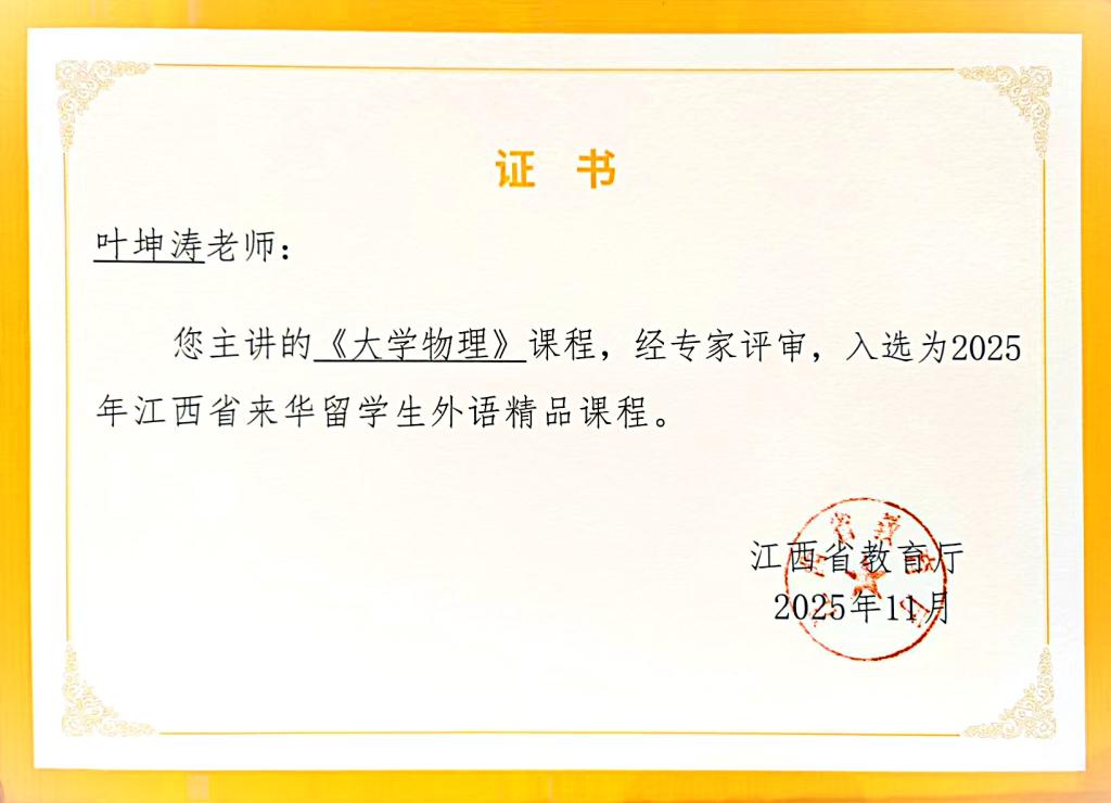 本网讯 11月26日至27日,首届江西省来华留学生外语精品课程展示活动暨教师英文授课能力提升研讨会在南昌举行。体育博彩 叶坤涛副教授主讲的《大学物理》课程成功入选首批江西省来华留学生外语精品课程。