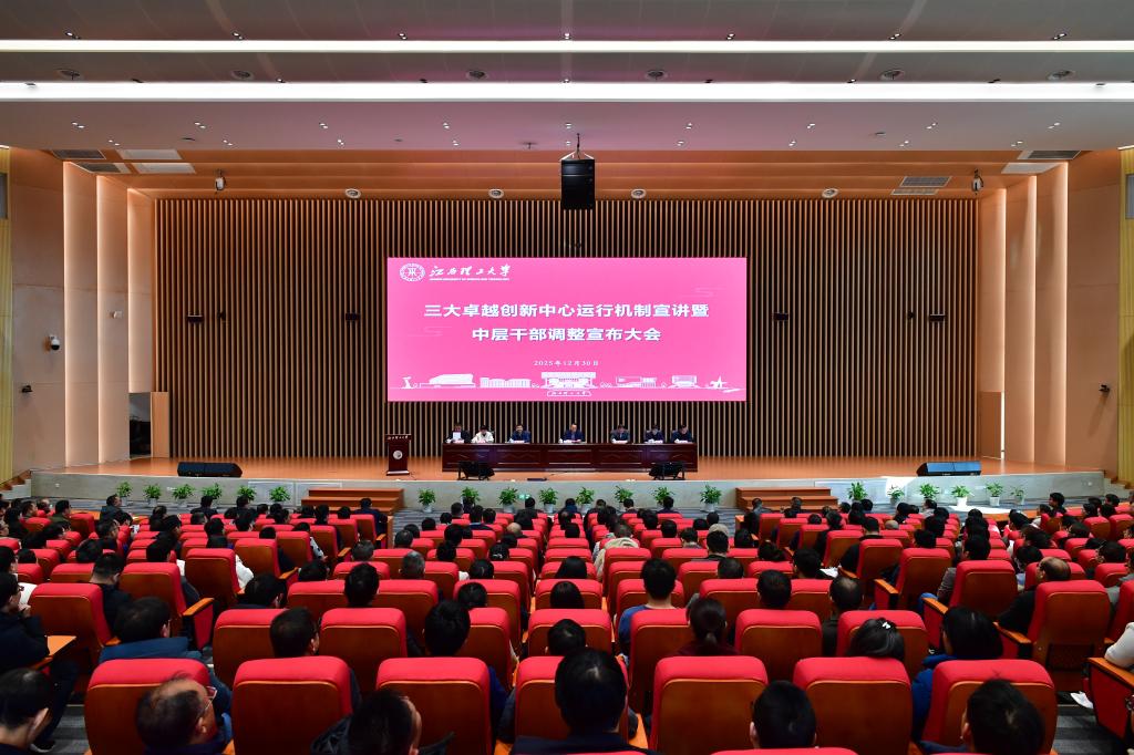 在三江校区东园志远会议中心1号厅召开三大卓越创新中心运行机制宣讲暨中层干部调整宣布大会,会议设先进铜产业学院(鹰潭)和红旗校区安全工程学院两个视频分会场。全体在家校领导、党委常委,三大中心全体教职工,学校相关职能部门负责人参加会议。会议由校党委常委、副校长熊志华主持。
