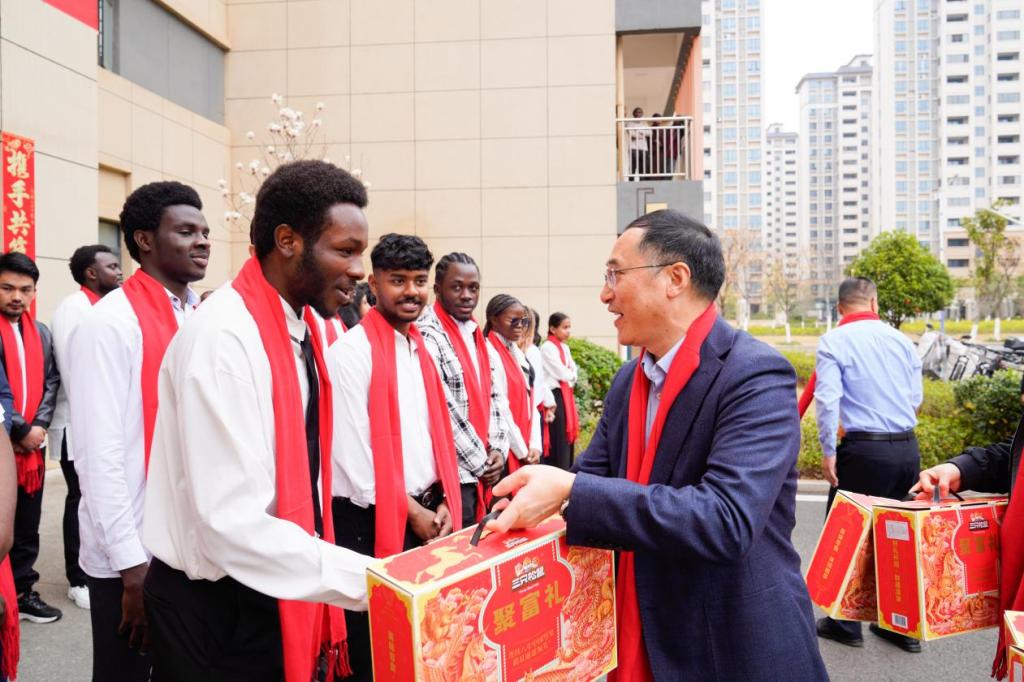 刘祖文代表学校向留校国际学生致以新春的美好祝福。他表示,春节是中华民族最重要的传统节日,希望同学们利用假期深入感受中国年味,在异国他乡也能感受到家的温暖,并勉励大家在新的一年里加强学习,做中外文化交流的友好使者。随后,校领导为留校国际学生送上新春慰问礼物,并与大家合影留念。