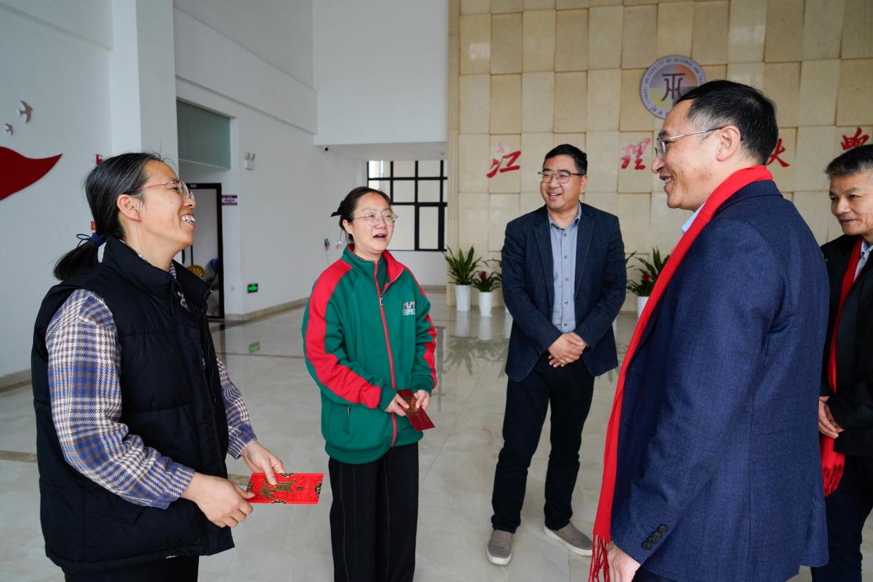 本网讯 金马贺岁,情暖除夕。为向春节期间坚守岗位的教职员工致以新春的问候和诚挚的祝福,让留校国际学生感受中国传统节日的温暖与魅力,2月16日上午,校领导刘祖文、徐志峰、董冰岩、熊志华带队,分别前往三江校区、红旗校区、南昌校区开展除夕走访慰问活动,为在岗值班值守教职员工送上新春关怀,与留校国际学生共度美好时光。