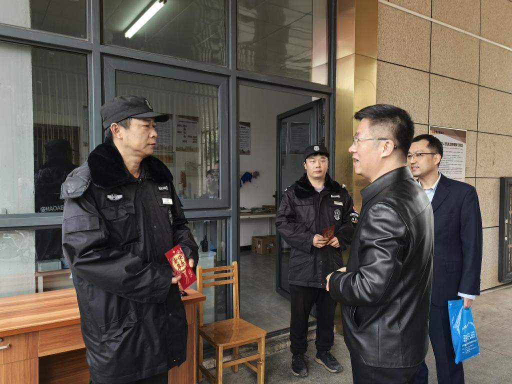 在红旗校区,校党委副书记徐志峰一行先后前往金雅居西一门门岗、校区南大门保卫门岗、水电值班点、保卫处101 室、校医院二楼诊室、原行政楼大厅门卫岗,为各岗位值班人员送上新春祝福,仔细询问校区安全保卫、后勤保障等工作落实情况,要求相关部门切实做好值班保障,让值班人员安心工作、暖心过节。