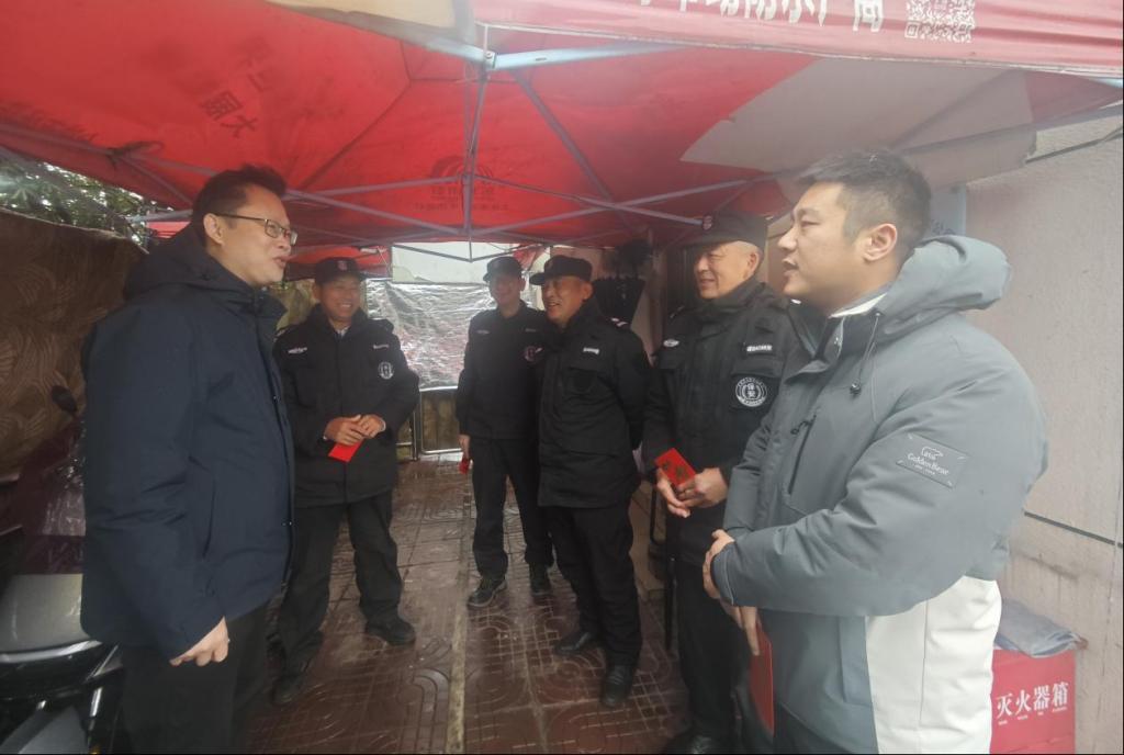 在三江校区,校党委书记刘祖文、副校长董冰岩一行从东园F18 栋一楼物业值班点出发,先后走访校医院、F10 栋值班室、西区食堂、执中楼各值班点、濂溪楼大厅岗、南阳门出口门岗、西园南门入口门岗等多个点位,与物业、校医院、食堂、安保、水电等岗位的值班人员一一握手问好,致以新春的祝福,希望大家继续坚守岗位,确保校园各项工作平稳运行。