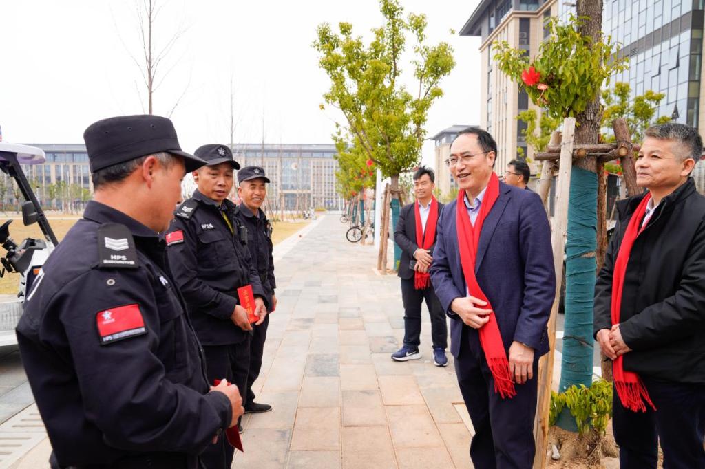 在南昌校区,副校长熊志华先后走访北门保卫门岗、图书信息综合楼物业值班点、总值班室、卫生所、南门保卫门岗等点位,与安保、物业、水电、医护等值班教职员工深入交流,了解校区春节期间的各项保障工作,对大家舍小家、顾大家,坚守一线、默默奉献的精神给予衷心感谢,并希望在岗教职工用心用情做好服务保障,确保校园平安有序。