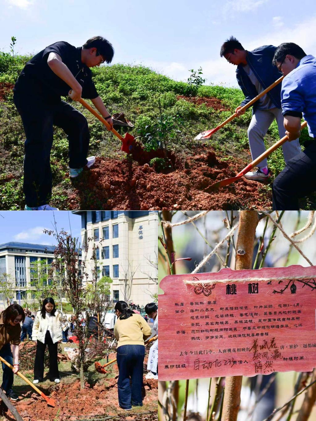 本次活动中,至善园和量子园辅导员和学生代表共57人种植桃树,红旗园辅导员和学生代表共57人种植李树,风华园和正茂园辅导员和学生代表共74人种植脐橙树。活动将生态文明教育、师德师风建设、乡土情怀培育与劳动实践深度融合,在美化校园的同时,也在师生心中播下绿色理念、师德初心与家国情怀的种子。