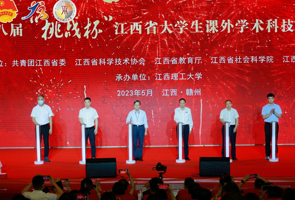 主、承办方六位领导嘉宾共同按下启动按钮,宣布2023年“挑战杯”江西省赛正式开幕。