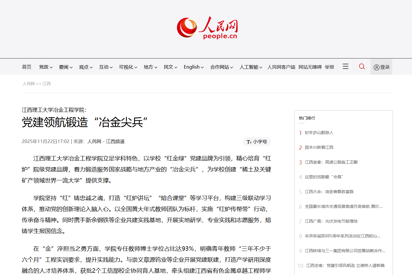 冶金工程学院立足学科特色,以学校“红金绿”党建品牌为引领,精心培育“红炉”院级党建品牌,着力锻造服务国家战略与地方产业的“冶金尖兵”,为学校创建“稀土及关键矿产领域世界一流大学”提供支撑。
