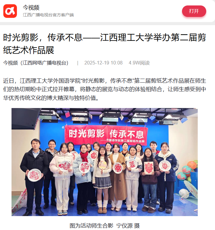 外国语学院黄维清老师表示,此次展览不仅是剪纸艺术的展示,更是一堂生动的“第二课堂”,旨在引导青年在实践中增强文化自信,提升实践能力,让文化传承在亲身体验中扎根。(徐莹、谭欣荣)