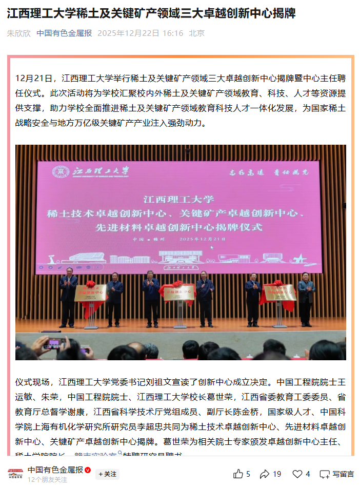 举行稀土及关键矿产领域三大卓越创新中心揭牌暨中心主任聘任仪式。此次活动将为学校汇聚校内外稀土及关键矿产领域教育、科技、人才等资源提供支撑,助力学校全面推进稀土及关键矿产领域教育科技人才一体化发展,为国家稀土战略安全与地方万亿级关键矿产产业注入强劲动力。