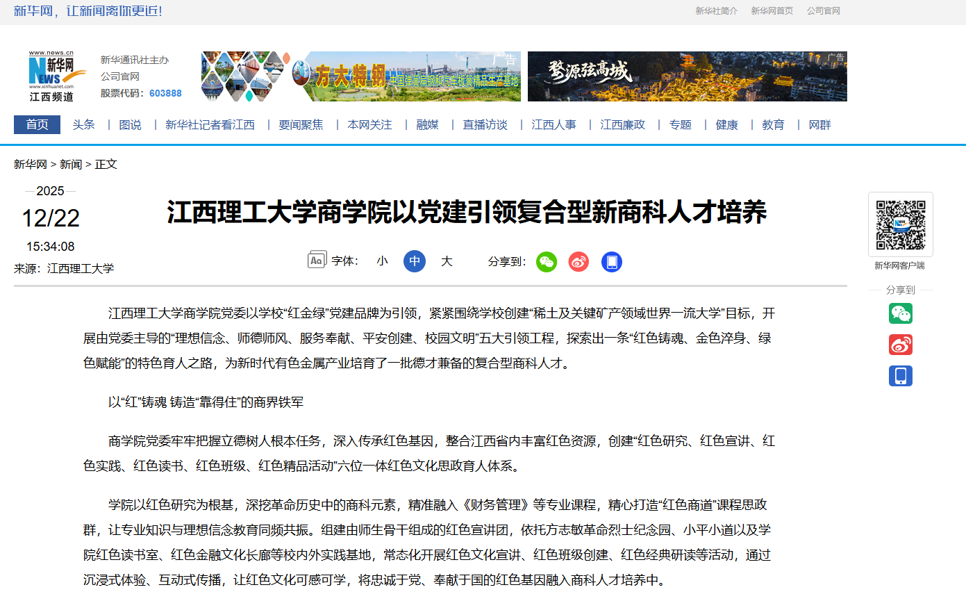 商学院将锚定学校党建品牌的“红铸忠诚、金淬担当、绿创未来”核心要义,深耕“数字商科”办学特色,精准对接有色金属产业需求,纵深推进“三色”引领育人改革,锻造更多“靠得住、用得上、留得下”的复合型实战人才,为江西有色金属产业数字化转型注入强劲动能,在学校高质量发展征程中书写商学院精彩篇章。(晁云 刘宇)