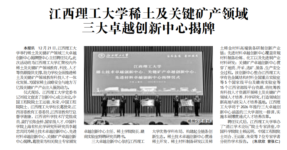 汇聚校内外稀土及关键矿产领域教育、科技、人才等资源提供支撑,助力学校全面推进稀土及关键矿产领域教育科技人才一体化发展,为国家稀土战略安全与地方万亿级关键矿产产业注人强劲动力。