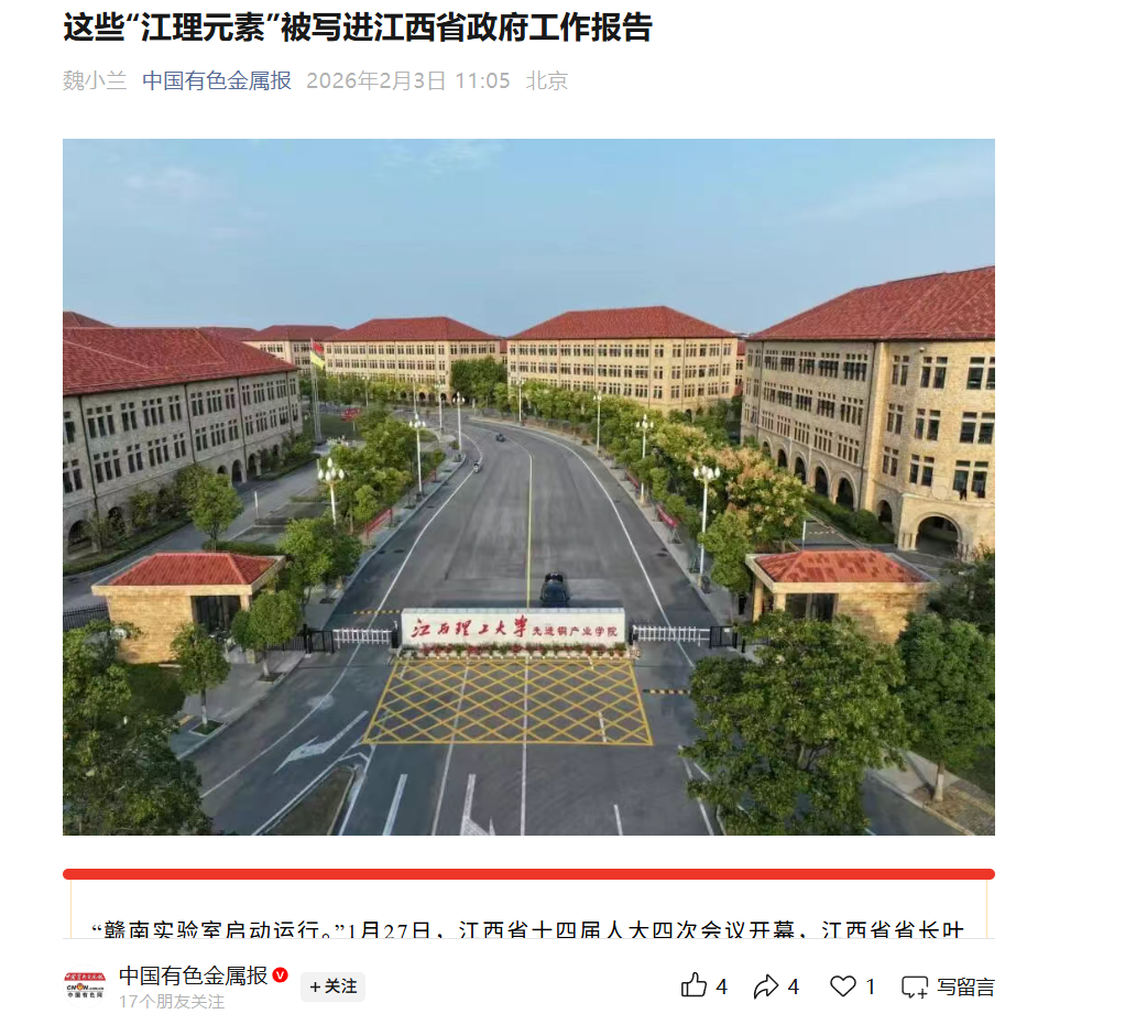 在回顾2025年工作时,该报告1次提到“江理元素”,明确点出“赣南实验室启动运行”。此前,赣南实验室启动会在体育博彩
