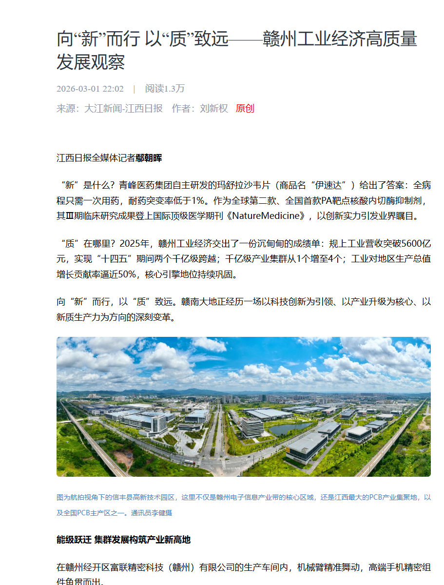 从富联精密的智能制造车间,到孚能科技的固态电池研发;从富尔特电子的数字化生产线,到青峰医药集团的技术创新——赣州正以一场深刻的产业变革,回应新时代发展命题。在新质生产力的赛道上,这片充满活力的热土,正以向“新”而行的魄力、以“质”致远的坚韧,跑出工业倍增升级的加速度。