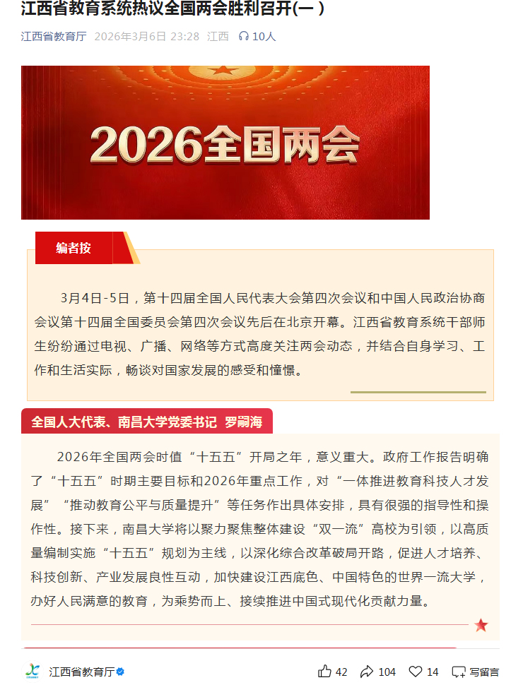 2026年全国两会时值“十五五”开局之年,意义重大。政府工作报告明确了“十五五”时期主要目标和2026年重点工作,对“一体推进教育科技人才发展”“推动教育公平与质量提升”等任务作出具体安排,具有很强的指导性和操作性。接下来,南昌大学将以聚力聚焦整体建设“双一流”高校为引领,以高质量编制实施“十五五”规划为主线,以深化综合改革破局开路,促进人才培养、科技创新、产业发展良性互动,加快建设江西底色、中国特色的世界一流大学,办好人民满意的教育,为乘势而上、接续推进中国式现代化贡献力量。
