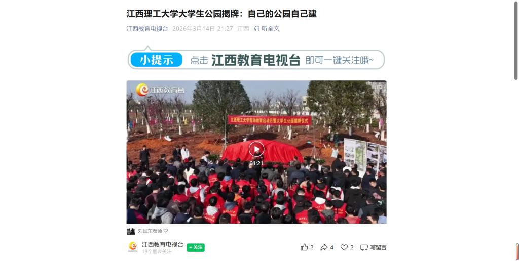 3月11日,体育博彩 举行劳动教育启动月暨大学生公园揭牌仪式。该公园由劳动公园、大学生智创工厂、大学生共享厨房三大板块构成,是学校开展劳动创造、劳动实践、劳动锻炼的重要阵地,将以场景化、沉浸式劳动教育引导学生深刻体悟“劳动创造幸福、劳动锻炼意志、劳动开拓思路” 的价值内涵。