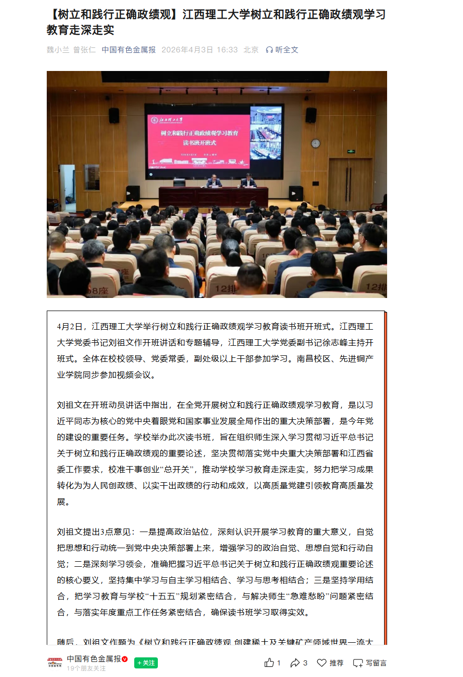 刘祖文在开班动员讲话中指出,在全党开展树立和践行正确政绩观学习教育,是以习近平同志为核心的党中央着眼党和国家事业发展全局作出的重大决策部署,是今年党的建设的重要任务。学校举办此次读书班,旨在组织师生深入学习贯彻习近平总书记关于树立和践行正确政绩观的重要论述,坚决贯彻落实党中央重大决策部署和江西省委工作要求,校准干事创业“总开关”,推动学校学习教育走深走实,努力把学习成果转化为为人民创政绩、以实干出政绩的行动和成效,以高质量党建引领教育高质量发展。