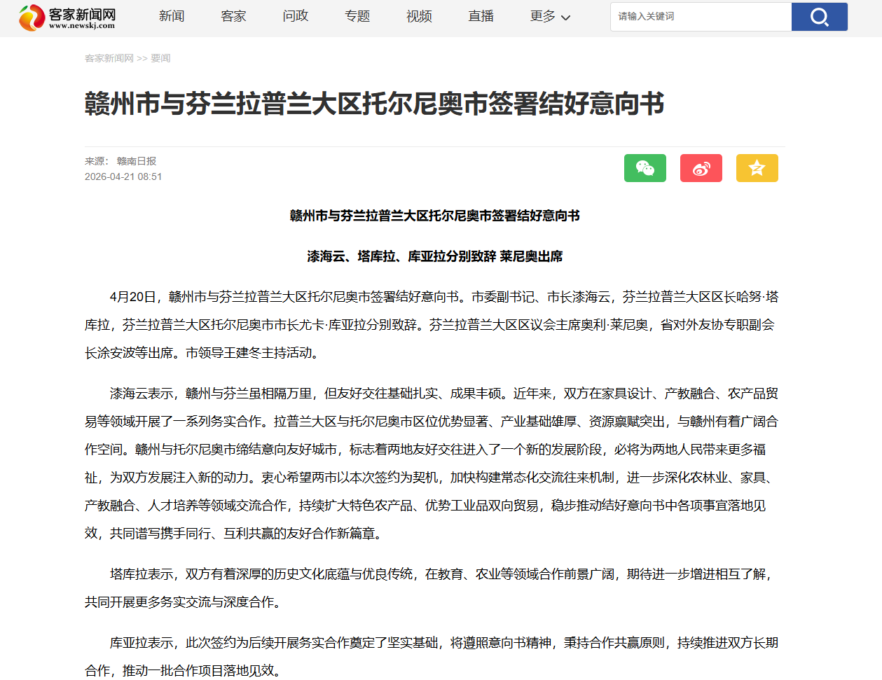 4月20日,赣州市与芬兰拉普兰大区托尔尼奥市签署结好意向书。市委副书记、市长漆海云,芬兰拉普兰大区区长哈努·塔库拉,芬兰拉普兰大区托尔尼奥市市长尤卡·库亚拉分别致辞。芬兰拉普兰大区区议会主席奥利·莱尼奥,省对外友协专职副会长涂安波等出席。市领导王建冬主持活动。