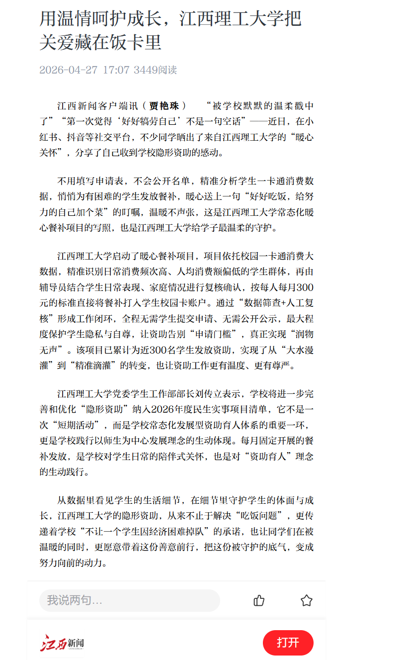 的隐形资助,从来不止于解决“吃饭问题”,更传递着学校“不让一个学生因经济困难掉队”的承诺,也让同学们在被温暖的同时,更愿意带着这份善意前行,把这份被守护的底气,变成努力向前的动力。