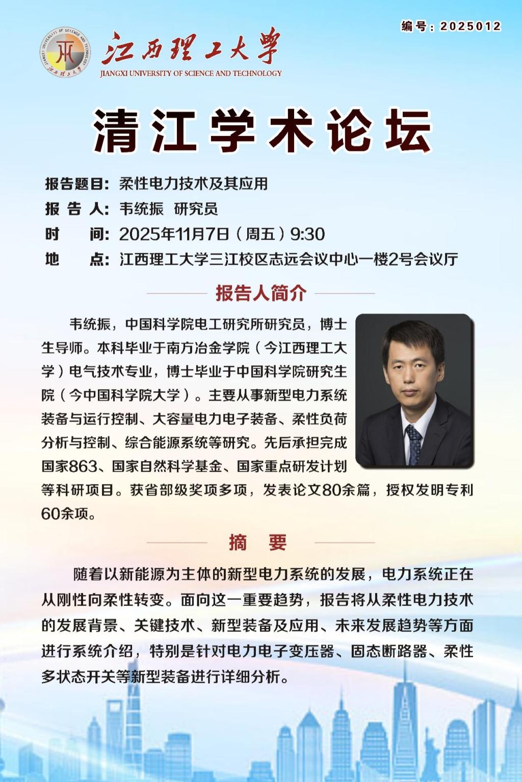 讲座背景:韦统振,中国科学院电工研究所研究员,博士生导师。本科毕业于南方冶金学院(今体育博彩 )电气技术专业,博士毕业于中国科学院研究生院(今中国科学院大学)。主要从事新型电力系统装备与运行控制、大容量电力电子装备、柔性负荷分析与控制、综合能源系统等研究。先后承担完成国家863、国家自然科学基金、国家重点研发计划等科研项目。获省部级奖项多项,发表论文80余篇,授权发明专利60余项。