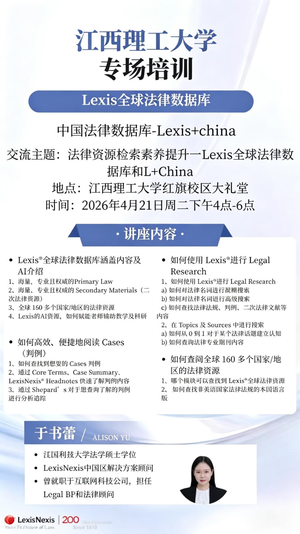 讲座主题:法律资源检索素养提升---Lexis全球法律数据库和L+China