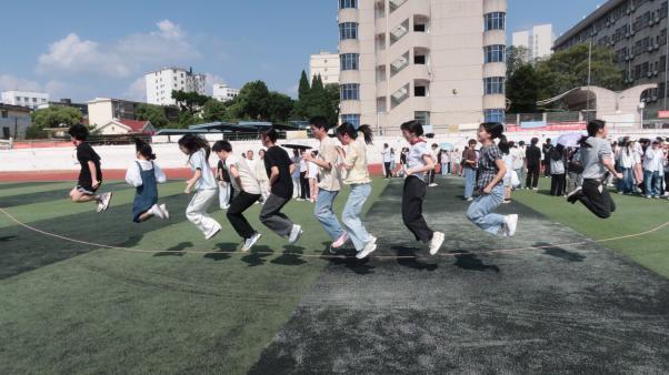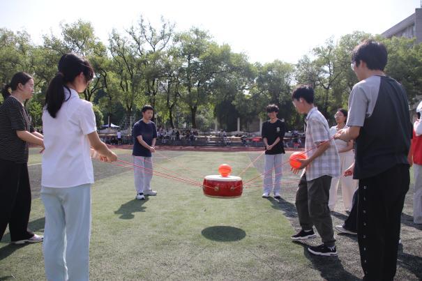 随着裁判一声令下,各项趣味赛事有序展开。在同炉共进项目中,队员们脚踝相绑、手臂相挽,齐声喊着“一二、一二”的口号并肩前行。步伐整齐划一,节奏稳定有力,队员们相互鼓励,50米的赛道上,每一步都踏出了团结的节拍,用行动诠释了“人心齐,泰山移”的深刻内涵;钨金战鼓项目中,队员们围鼓而立、紧握长绳,凝神聚力控制鼓面平稳,小小鼓面之上,跳动的不仅是排球,更是同心协力、配合无间的团队信念;金石投趣现场欢乐不断,趣味十足。投掷手瞄准目标、奋力抛投,背篓手灵活移动、精准接球,排球在空中划出一道道轻快弧线;矿脉齐跃项目将赛场气氛推向高潮。长绳在空中翻飞盘旋,摇绳同学节奏稳定,参赛队员依次入绳、轻盈跳跃。大家脚步轻快、身姿灵动,把握节奏、勇敢冲刺,即便偶有绊绳,也立刻重整状态继续拼搏;最热血的当属稀土争锋拔河比拼。参赛队员紧握绳索、重心下沉,咬紧牙关、全力后拉。绳索中间的标记来回拉锯,每一次偏移都牵动着全场观众的心。队员们心往一处想、劲往一处使,以坚韧毅力与强大凝聚力,展现出两院学子不服输、不放弃的拼搏精神。
